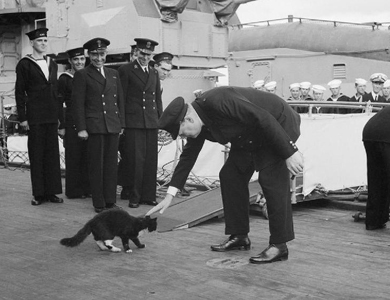Let’s not forget the Industrial Revolution and the two world wars, where cats played a major role. They hunted vermin on warships and often became the crew’s mascot. Such is the case for Blackie, who became one of the most famous cats in the world after being filmed and photographed by the press being petted by Winston Churchill himself on a ship, during a historic meeting with President Roosevelt.