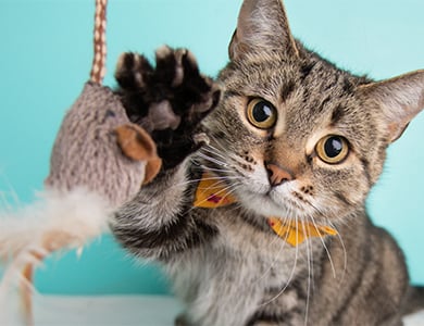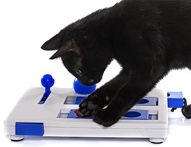 Les solutions présentées plus haut conviennent à tous les chats, qu’ils aient un poids santé ou non. Le point à retenir? Pour que minou veuille bouger ou utiliser les enrichissements de l’environnement que vous avez installés pour lui, il faut que ça lui rapporte quelque chose. Pour certains, ce sera la nourriture qui les encouragera. Dans ce cas, il n’est pas nécessaire d’ajouter de la nourriture! On exploite la ration journalière pour faire bouger le chat. Pour d’autres (ou plutôt, pour la majorité), commencer par des défis très faciles et payants incitera le chat à continuer et, avec le temps, on pourra lui en demander de plus en plus. Demandez à votre conseiller Mondou quels jouets et bols interactifs sont les plus appropriés pour votre chat.