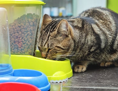 Premièrement, il faut consulter son vétérinaire pour vérifier les portions que notre animal devrait consommer. La quantité peut varier en fonction de la taille et de la race du chat. Il ne faut généralement pas se fier à ce qui est écrit sur le sac. En effet, nos chats d’intérieur dépensent souvent beaucoup moins d’énergie que ce qui est utilisé dans le calcul des portions. En calculant la portion journalière de nourriture de minou, on évite les excès!