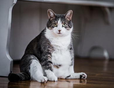 Heu! Attendez une seconde! Grossir ne ferait pas partie du souhait, n’est-ce pas? Pourtant, c’est la réalité de bon nombre de nos félins domestiques. On estime que plus de 60 % de la population féline est en surpoids, ou plus précisément, dont le poids est 10 à 20 % plus lourd que ce qu’il devrait être normalement. Et le bilan s’alourdit : les chats d’aujourd’hui pèseraient ¼ kg (½ livre) en trop de plus qu’à la fin du siècle dernier1.