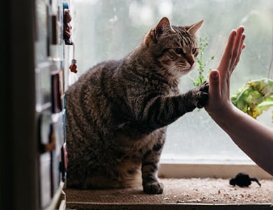 Présentez la main bien au-dessus de la tête de votre chat, comme si vous vouliez qu’il fasse un « top là » (voir photo). Dès qu’il touche votre main avec sa patte, dites « Bravo » et donnez-lui la gâterie.