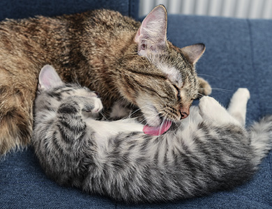 La mère va laver intégralement chacun de ses chatons dès leur naissance, et ce, assez intensément durant les 3 premières semaines. Par ce fait même, elle active la circulation sanguine des chatons et les identifie tous à une même odeur familiale. Cette odeur sera celle qui servira à tous les membres pour s’identifier à la même famille et restera l’odeur familiale tant que les chats demeureront ensemble. Sitôt qu’ils seront séparés pour quelques semaines, chacun aura son odeur et pourra oublier l’odeur familiale. Ceci explique pourquoi même des frères et sœurs peuvent ne plus se reconnaître si on tente de les réunir après un certain temps de séparation.