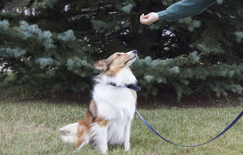 - Après avoir fait sentir la gâterie à votre chien, levez celle-ci au-dessus de sa tête et dirigez-la légèrement vers l’arrière de sa tête.