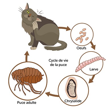- Elles sont présentes dans l’environnement sous plusieurs formes d’œufs, de larves et d’insectes. Il faut donc couvrir tous les stades pour pouvoir s’en débarrasser de façon définitive, ce qui peut prendre 4 mois au minimum.