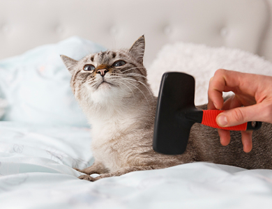Il existe plusieurs types de brosse et de peigne adaptés à chaque type de pelage selon la race de votre chien ou de votre chat. Consultez nos conseillers en magasin, ils se feront un plaisir de vous assister à ce sujet. On peut également utiliser un shampoing contre la mue pour accentuer les résultats du brossage à la maison.