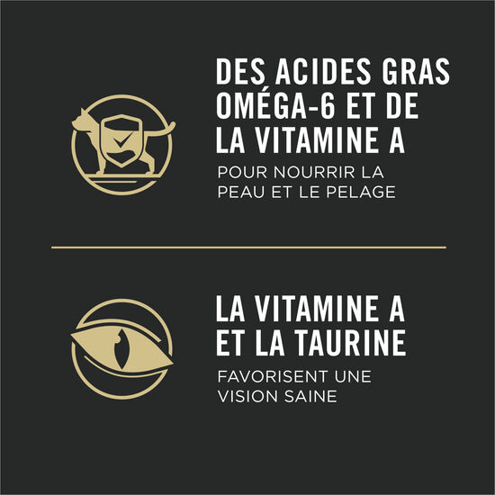 - La formule alimentaire pour chats à teneur élevée en protéines renferme des antioxydants pour favoriser un système immunitaire en santé, ainsi que des acides gras oméga-6 et de la vitamine A pour nourrir la peau et le pelage