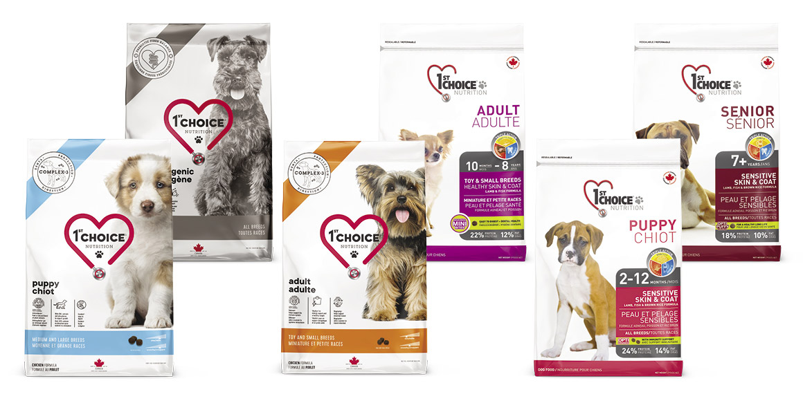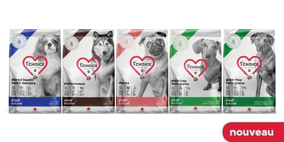 Découvrez nos produits 100% Québécois et aidez vos petits compagnons poilus à vivre longtemps et en santé! Depuis plus de 30 ans, notre mission est d’offrir une nourriture haut de gamme, fonctionnelle et personnalisée, qui répond aux besoins spécifiques de vos animaux de compagnie! Nos formules sont élaborées par une équipe d’experts en nutrition animale et sont adaptées à la taille ainsi qu’au stade de vie des chiens et chats. 1st Choice, c’est plus de 27 formules faites à partir d’ingrédients de qualité supérieure, sans hormones, sans antibiotiques et sans maïs, soya, ou blé. La protéine d’origine animale est la base de nos formules et nous n’utilisons que des saveurs naturelles incomparables.