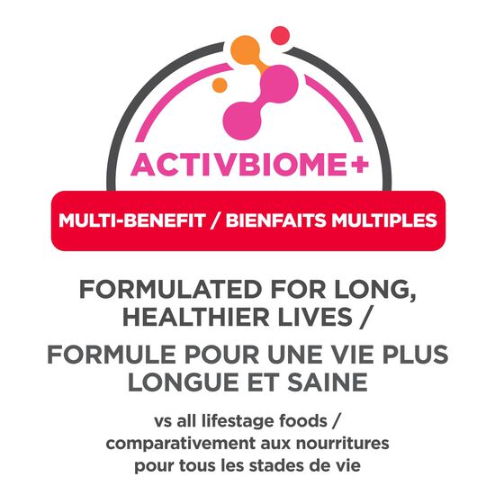 Farine de poulet, orge perlé concassé, fibres de pois, blé entier, maïs entier, farine de gluten de maïs, sorgho entier, cellulose en poudre, saveur de foie de poulet, huile de soya, pulpe de betterave séchée, graines de lin, acide lactique, saveur de porc, chlorure de potassium, L- lysine, sel iodé, chlorure de choline, carbonate de calcium, vitamines (supplément de vitamine E, L- ascorbyle-2-polyphosphate (source de vitamine C), supplément de niacine, mononitrate de thiamine, supplément de vitamine A, pantothénate de calcium, supplément de riboflavine, biotine, supplément de vitamine B12, chlorhydrate de pyridoxine, acide folique, supplément de vitamine D3), minéraux (sulfate de fer, oxyde de zinc, sulfate de cuivre, oxyde manganeux, iodate de calcium, sélénite de sodium), taurine, fibres d';avoine, tocophérols mélangés pour la fraîcheur, L- carnitine, saveurs naturelles, bêta-carotène, pommes, brocoli, carottes, canneberges, petits pois.
