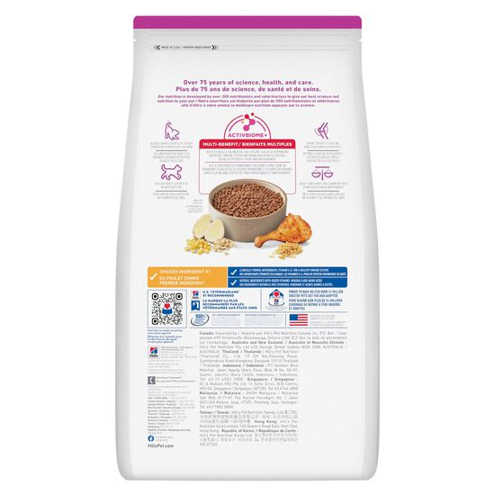 À mesure que les chiens de races petites vieillissent, leurs besoins nutritionnels évoluent. La nourriture sèche Hill’s Science Diet pour chiens adultes de 11 ans et + de races petites et miniatures est une nutrition conçue sur mesure pour aider les chiens de races petites et miniatures à vieillir en santé. La petite croquette est spécialement fabriquée avec des fibres prébiotiques pour soutenir la digestion de votre petit chien sénior, tandis que les acides gras oméga-3 de l’huile de poisson favorisent la santé des articulations. L’ensemble équilibré de minéraux de cette nourriture pour chiens séniors favorise la santé du cœur, des reins et de la vessie des chiens de races miniatures, tandis que les oméga-6 et la vitamine E nourrissent la peau et le pelage. Comme la santé immunitaire est essentielle pour les chiens séniors, cette nourriture pour animaux faite d’ingrédients naturels offre un mélange spécial d’antioxydants qui favorise la santé à long terme. Impossible de ne pas aimer le nouveau look de Science Diet. Certains de nos produits ont également changé de nom, de forme de croquettes et de formule.